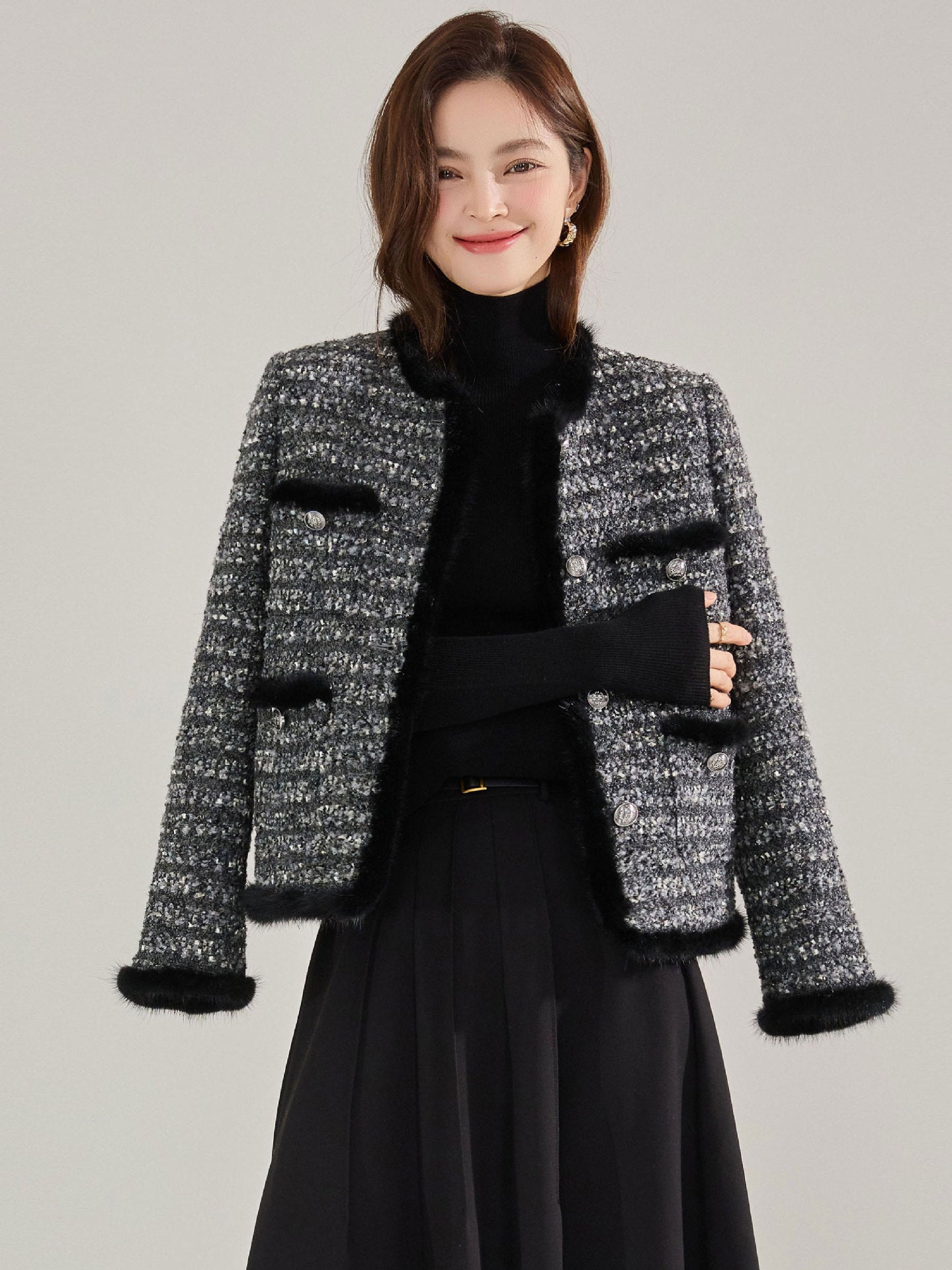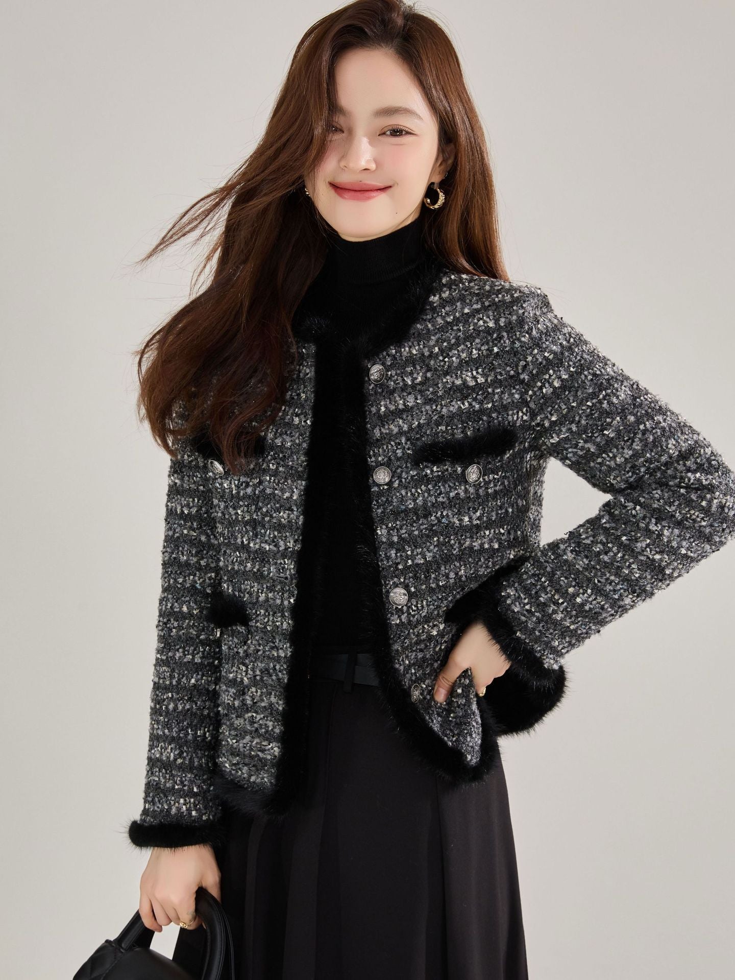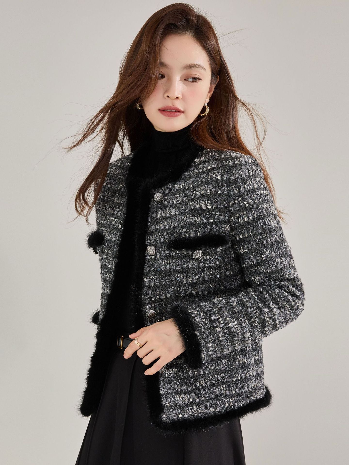 上品なツイード素材にミンクヘアステッチをあしらった、ラグジュアリーな印象のノーカラージャケット。コンパクトな丈感でスタイルアップ効果があり、スカートにもパンツにも合わせやすい万能アイテムです。しっかりとした厚みがありながら軽やかで、通勤やオフィス、ちょっとしたお出かけにもぴったり。クラシカルなデザインの中に韓国ファッションらしい洗練された雰囲気を感じられる一枚です。