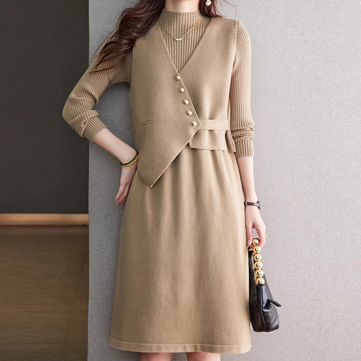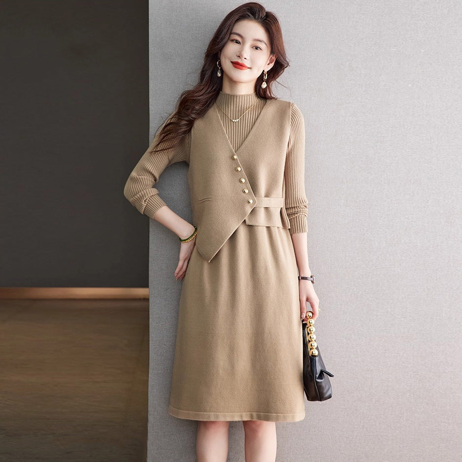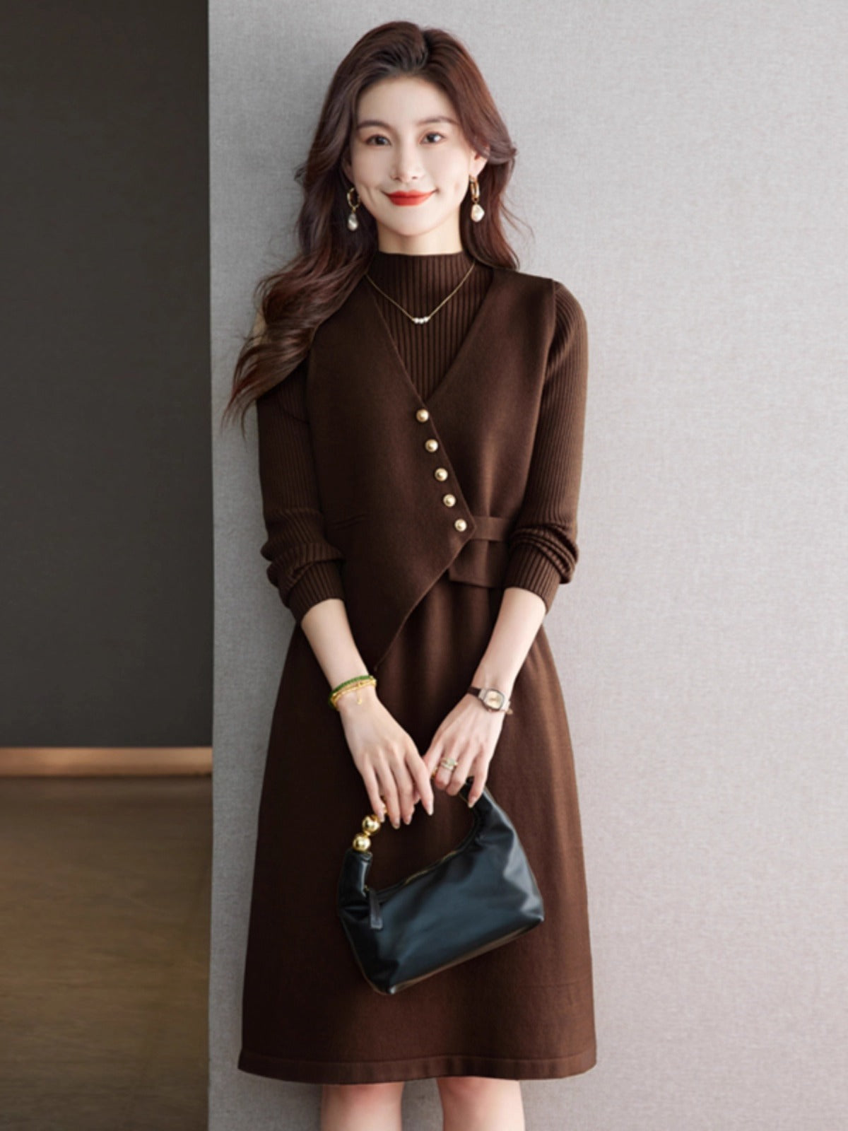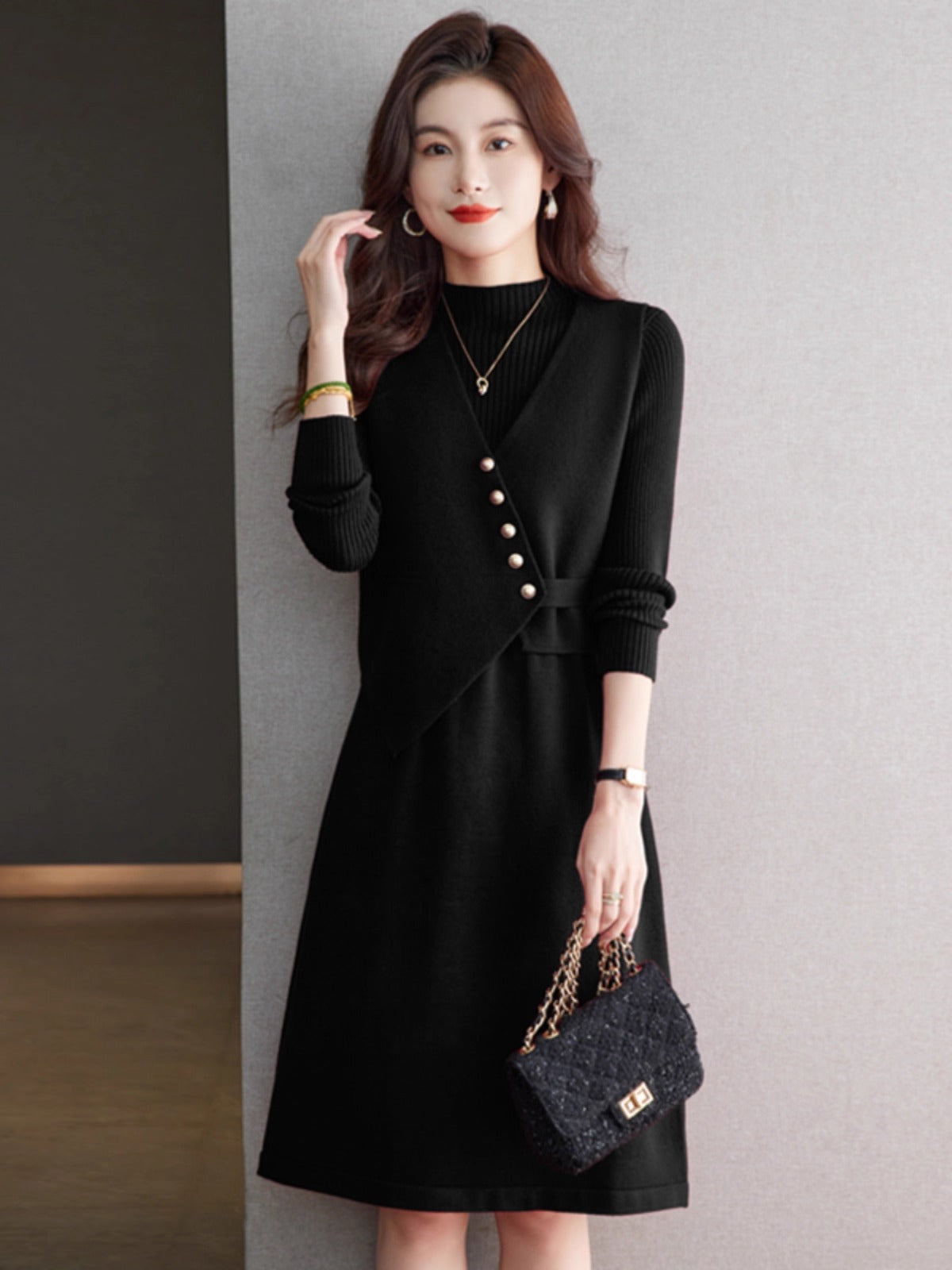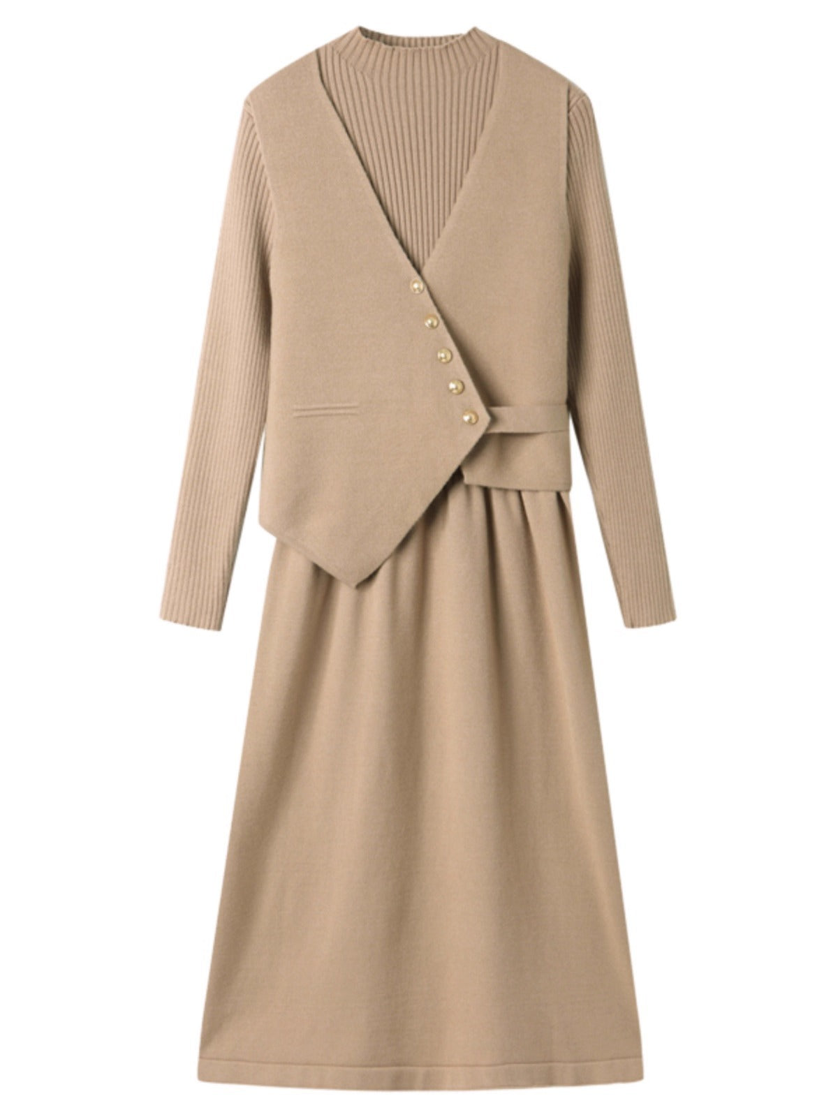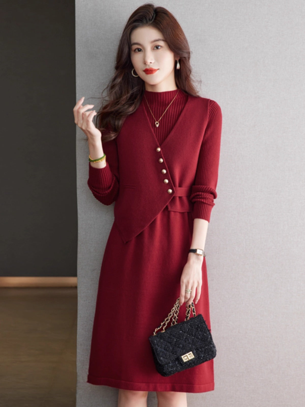 立体感のあるニット素材が上品な印象を与える、トップス&スカートのセットアップ風ワンピース。ウエストラインを美しく見せるラップ風デザインと、ゴールドボタンが華やかさをプラスします。柔らかく伸縮性のある素材で着心地が良く、通勤やお食事会、デートなど幅広いシーンに活躍。1枚でエレガントなコーデが完成する韓国ファッション風スタイルです。