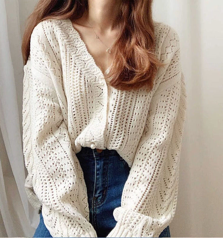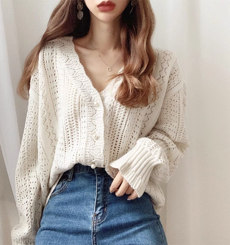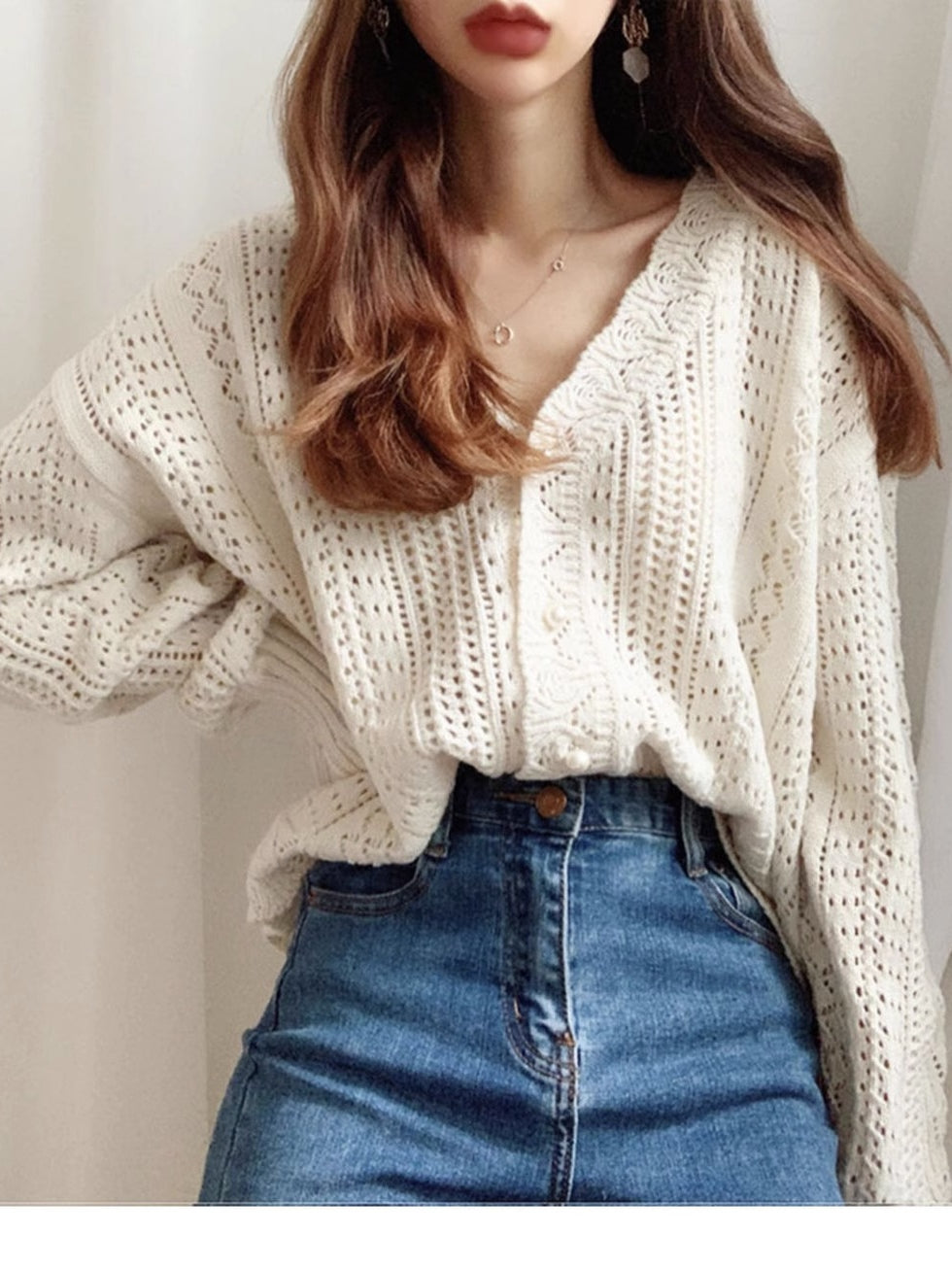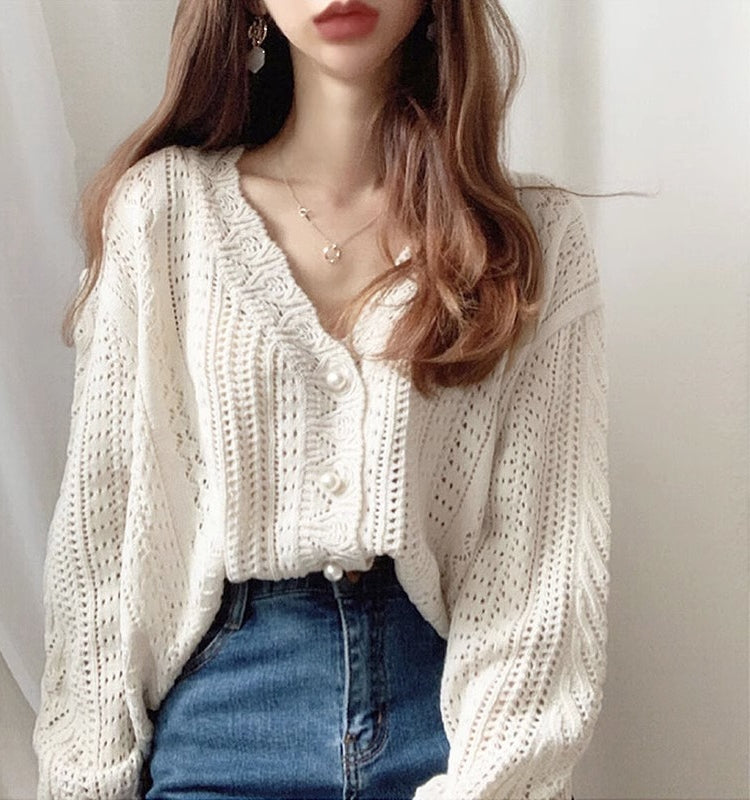 繊細な透かし編みデザインとパールボタンが女性らしさを引き立てるVネックカーディガン。柔らかい再生セルロース繊維を使用しており、肌ざわりが優しく通気性も抜群。ゆったりとしたプリンセススリーブとショート丈シルエットで、デニムにもスカートにも相性◎。カジュアルにもきれいめにも着こなせる万能アイテムで、通勤やオフィス、休日のお出かけにもぴったりです。