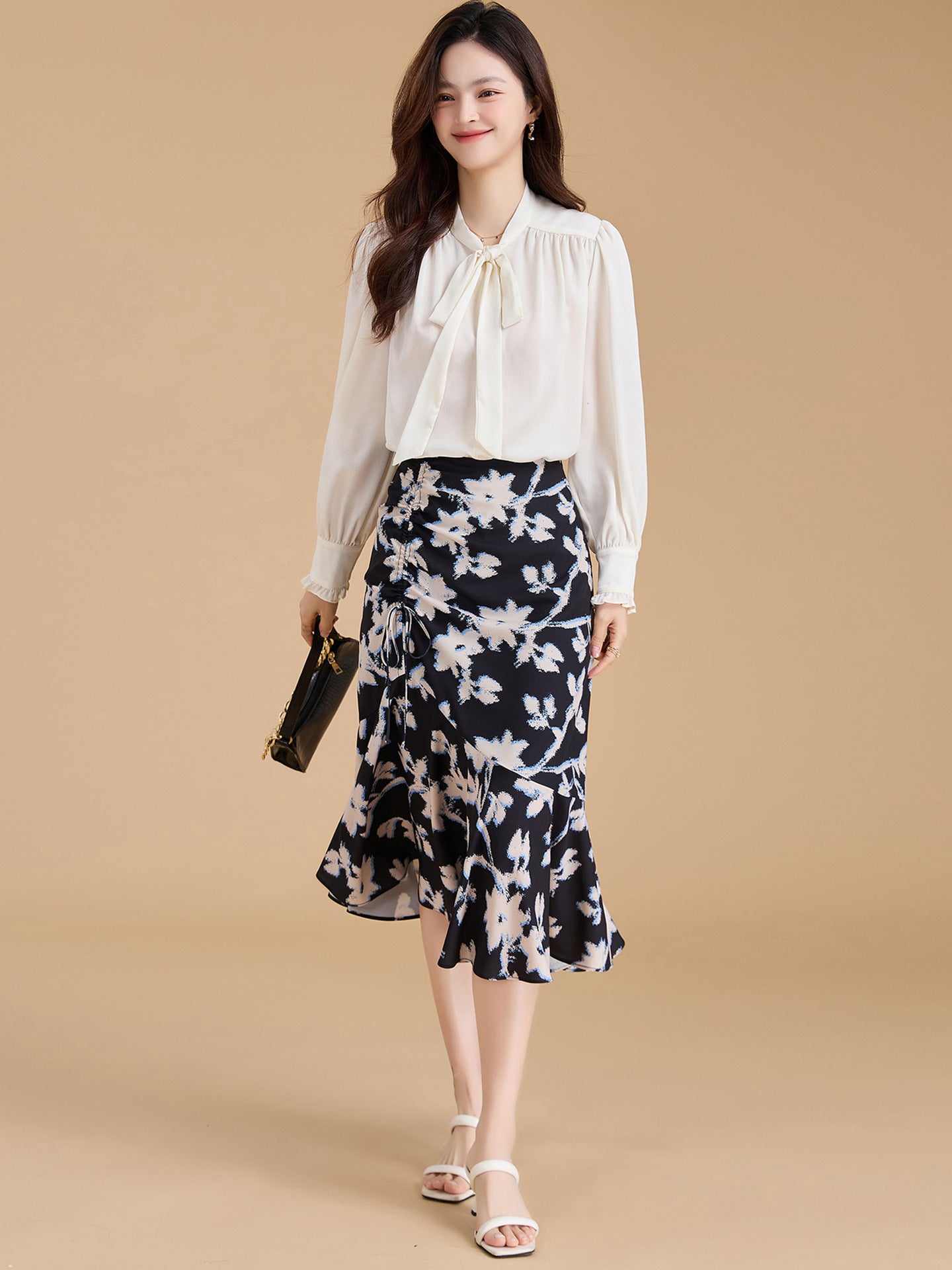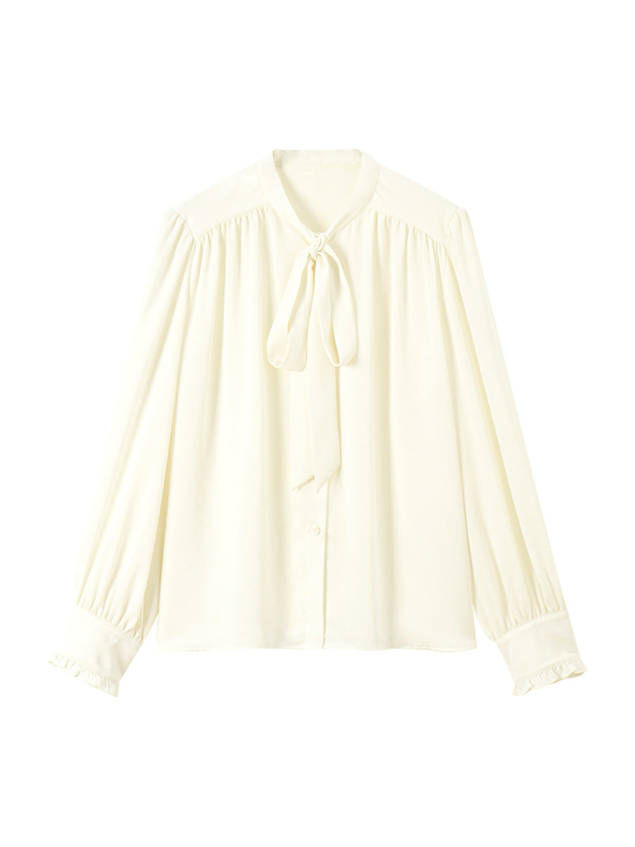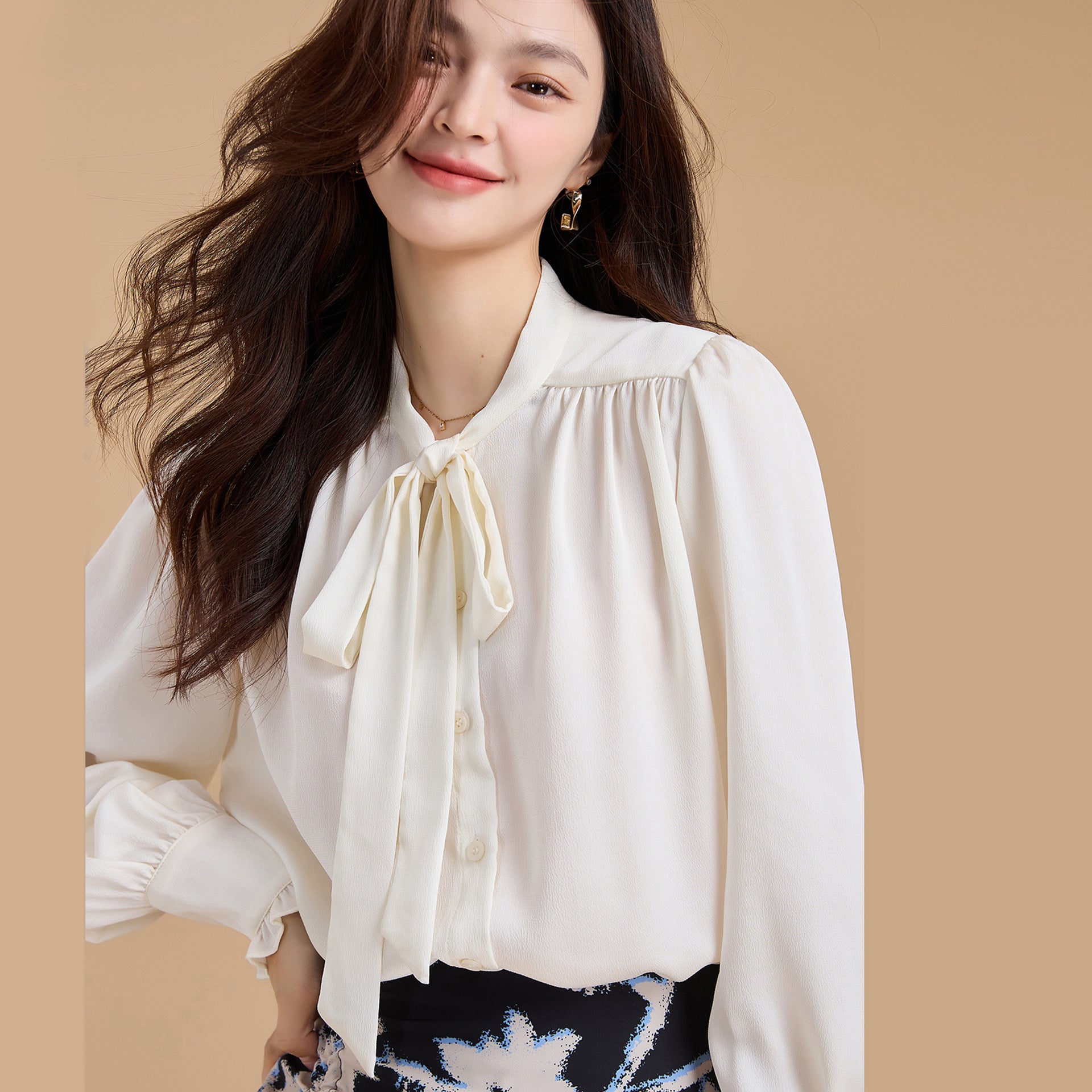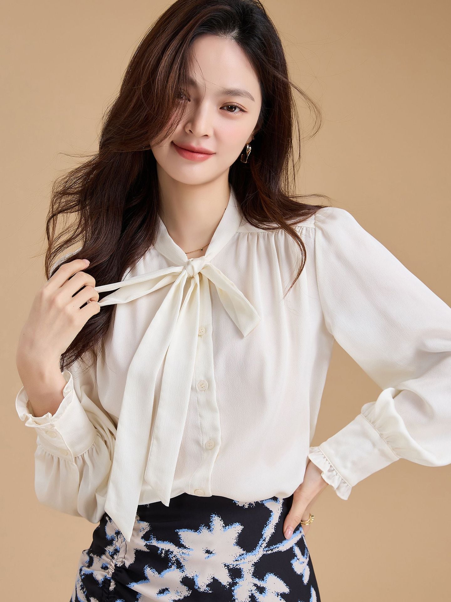 やわらかなシフォン素材を使用したボウタイ付きブラウス。程よい透け感と軽やかな質感が女性らしさを引き立て、動くたびに優しく揺れるシルエットが魅力です。首元のリボンタイは結び方次第で印象を変えられ、通勤やオフィスコーデにはもちろん、デートやお出かけにもぴったり。韓国ファッションらしい上品で清楚な雰囲気を演出します。